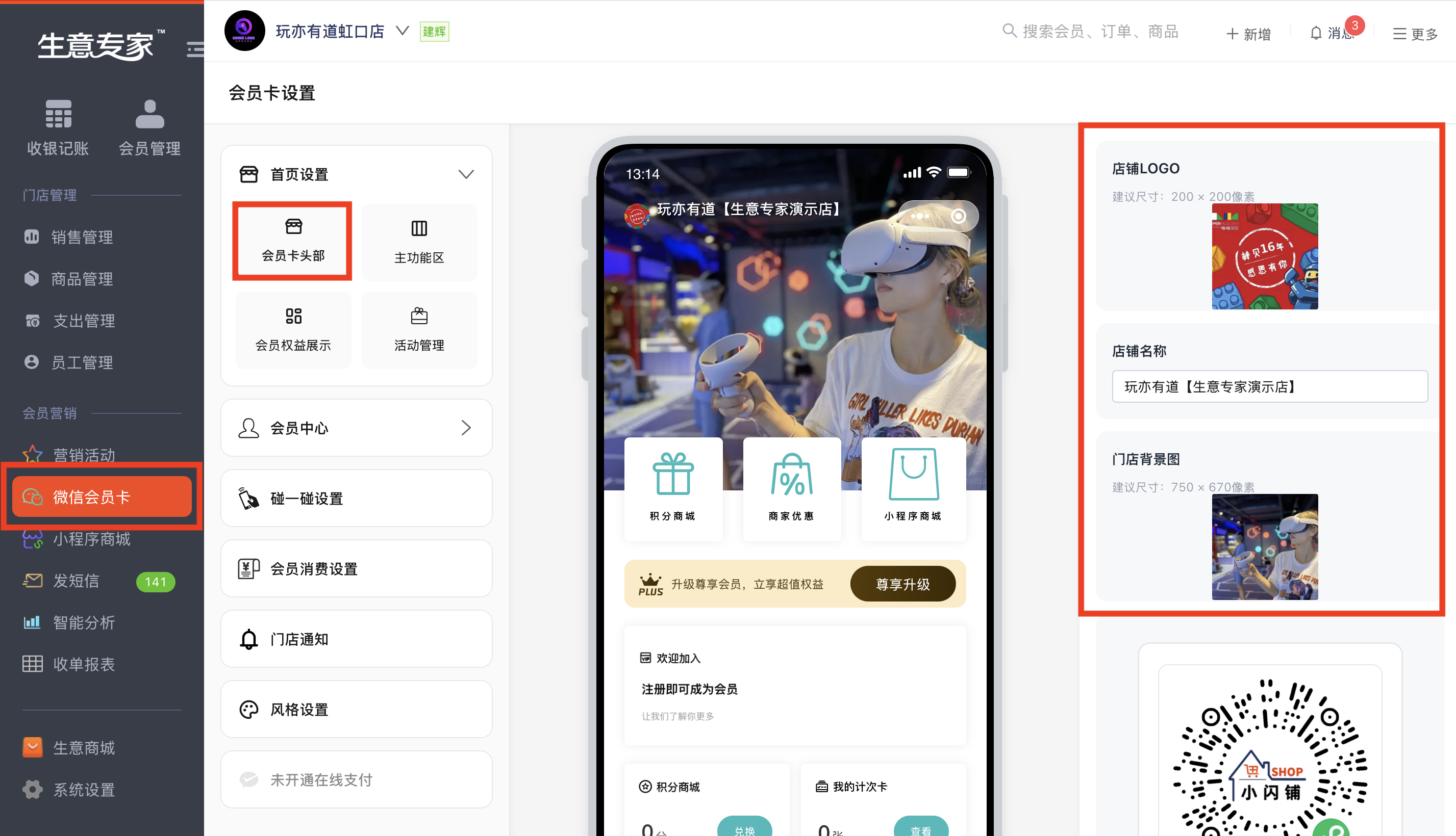 进入功能页 登录后,在左侧菜单栏找到“微信会员卡”,点击“首页设置”的“会员卡头部设置”中填写店铺名称、导入品牌logo与自定义图片。在“主功能区”页面还可以自定义积分商城、商家优惠、与小程序商城的顺序及排版模式。