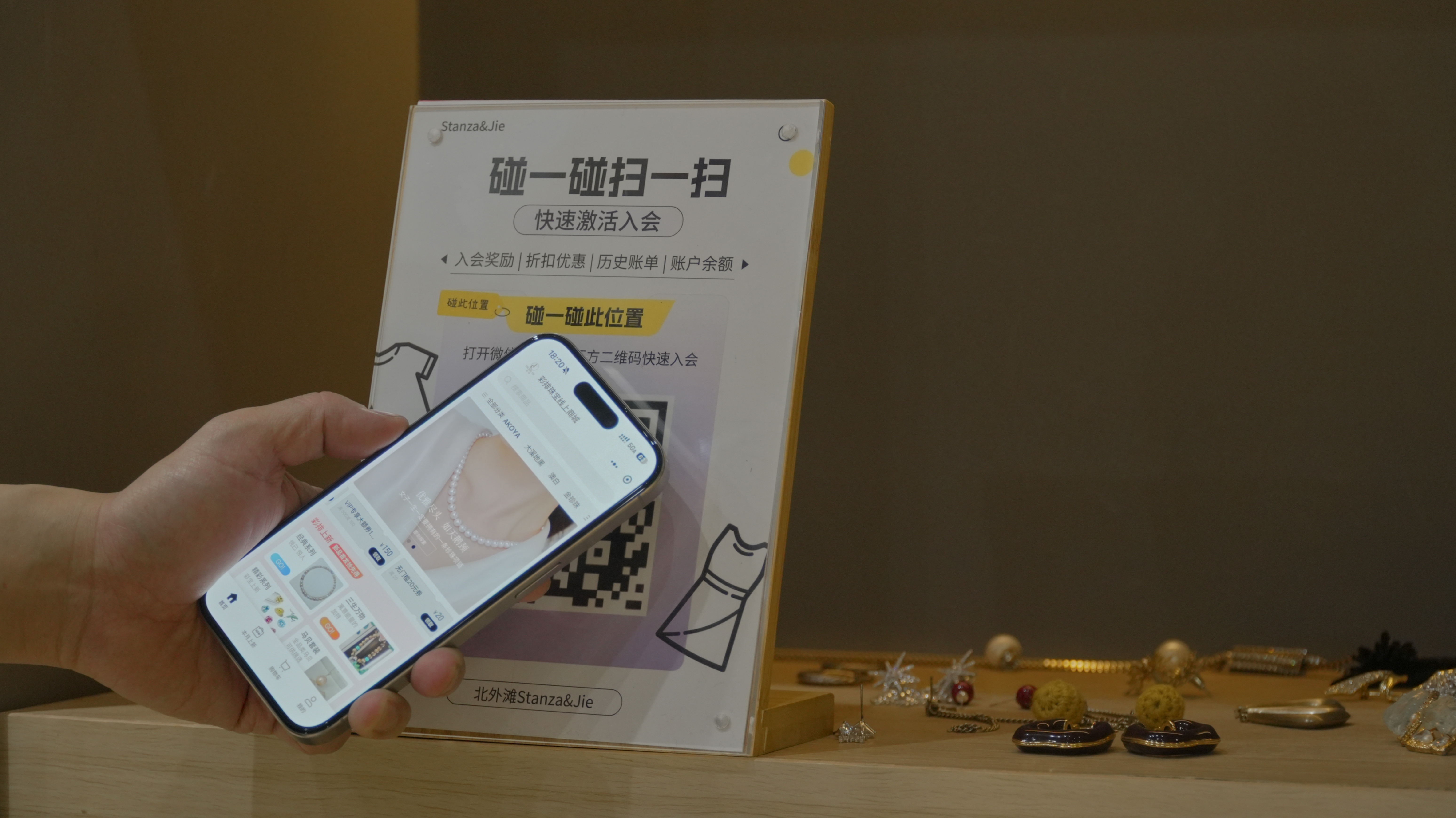 获取立牌 联系平台客服申请NFC碰一碰立牌,立牌会绑定你的会员卡系统。这种立牌无需电源,顾客用手机触碰就能弹出会员注册界面。